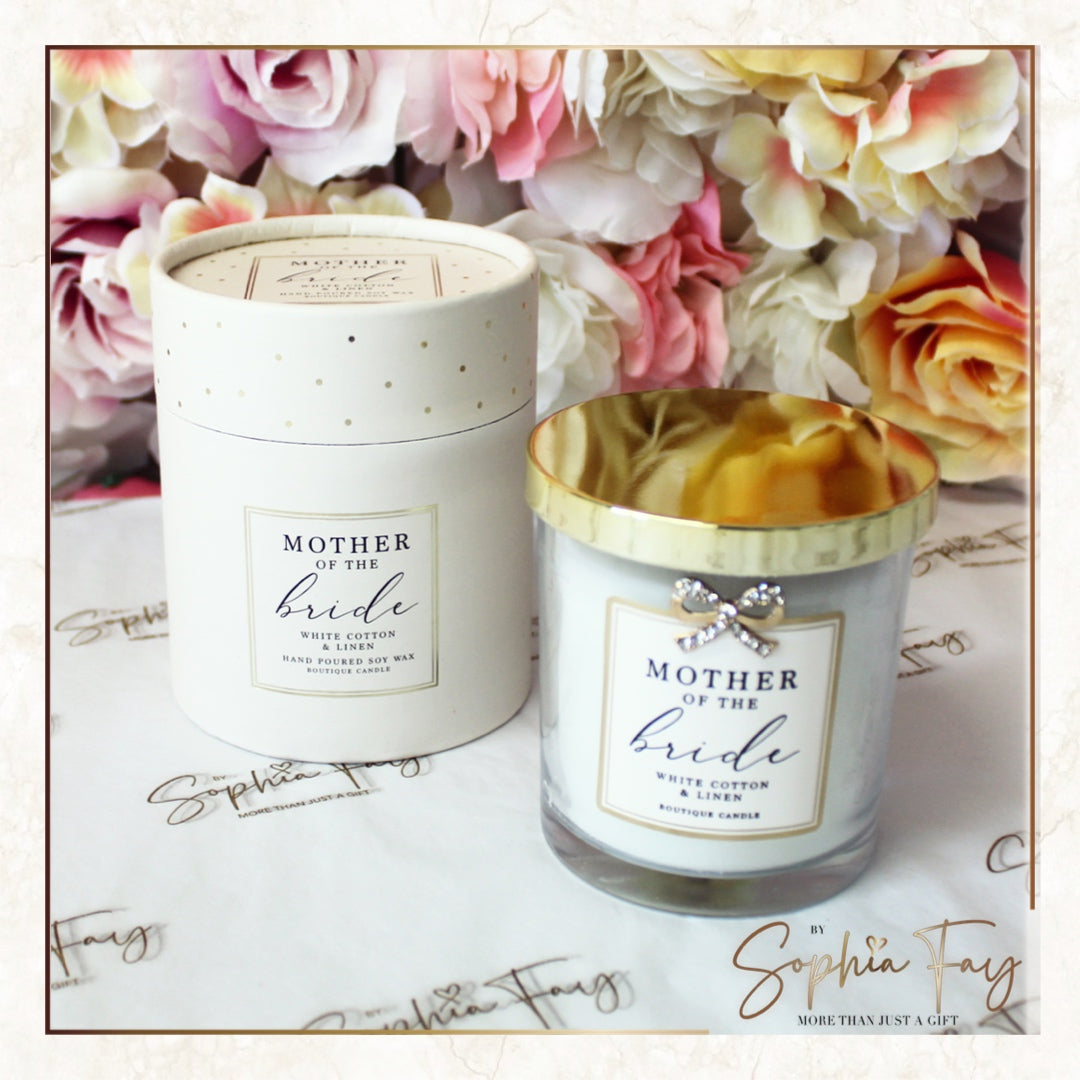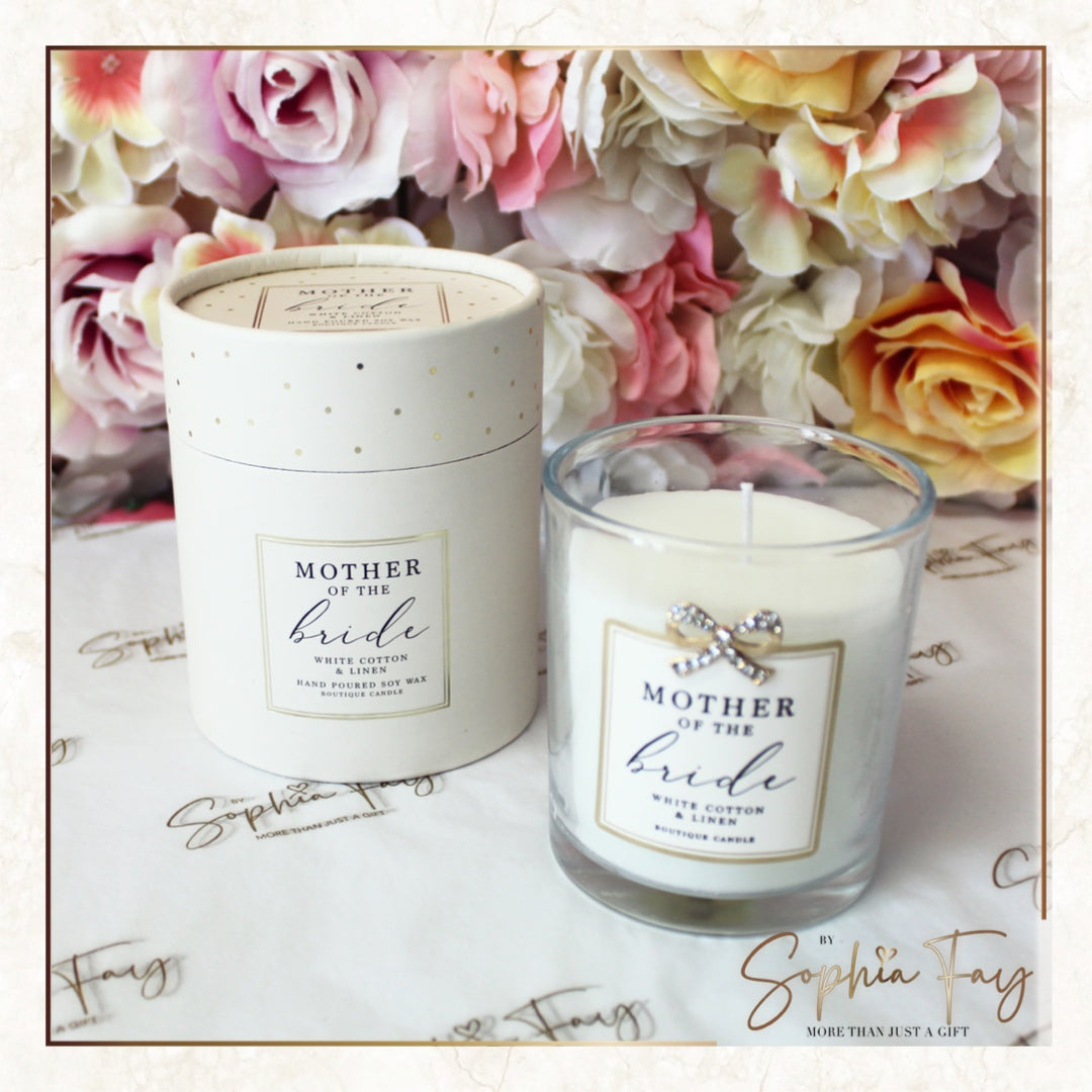 The Mother Of The Bride Candle in White Cotton And Linen scent comes designed in a 10cm jar with gold lid and small gold bow decorated with sparkling silver diamantes. Packaged in a cute well presented box.