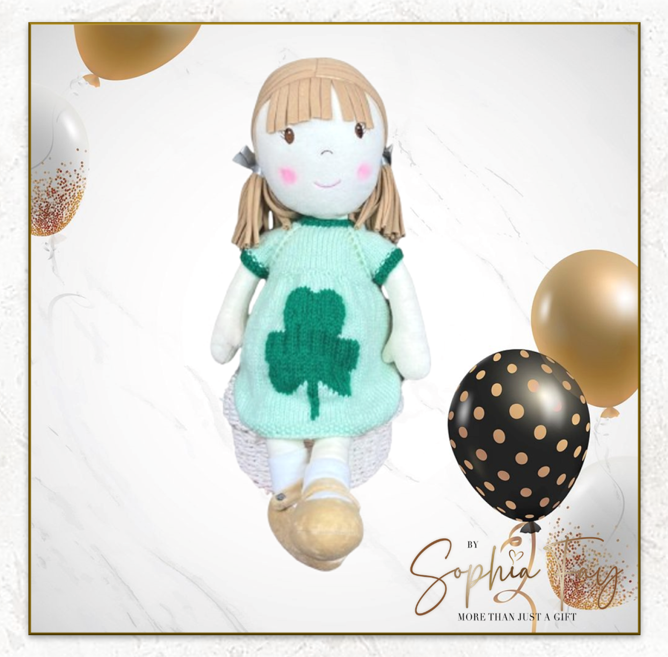 She is wearing a hand made dress just for St Patrick's Day, with a lucky shamrock, the perfect gift for St Patrick's Day.
